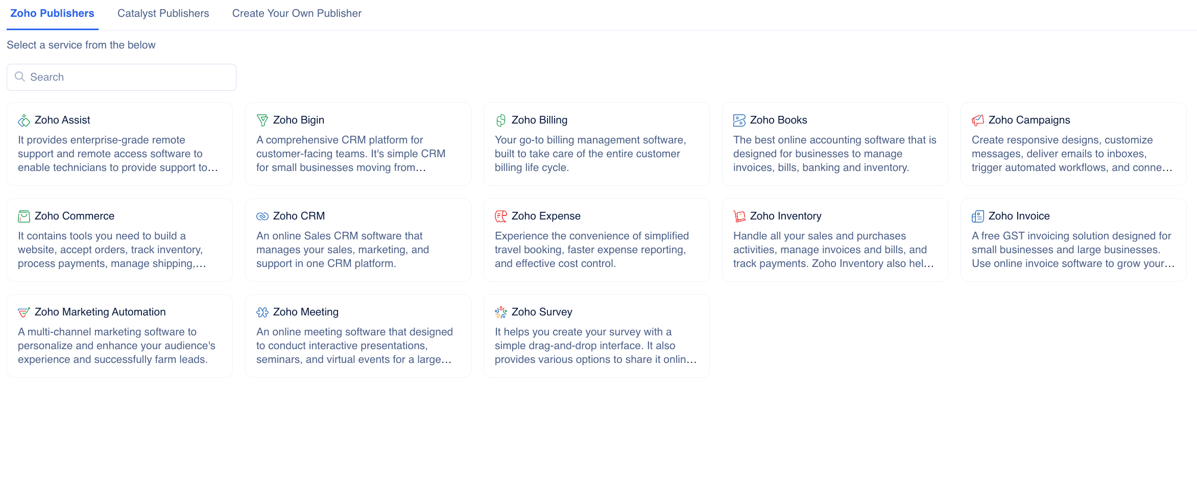 - Zoho Publishers – Events from Zoho products, available when the products are created using the same Zoho ID as the Catalyst account.