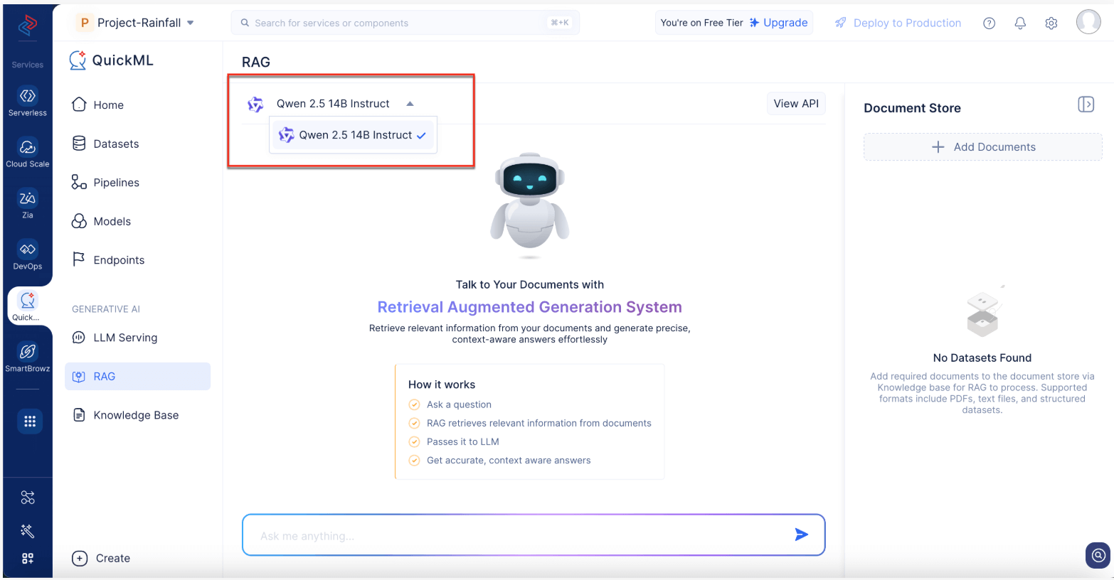 With QuickML, you don’t need to worry about these steps. Instead, you can build a fully functional RAG system in just two steps: